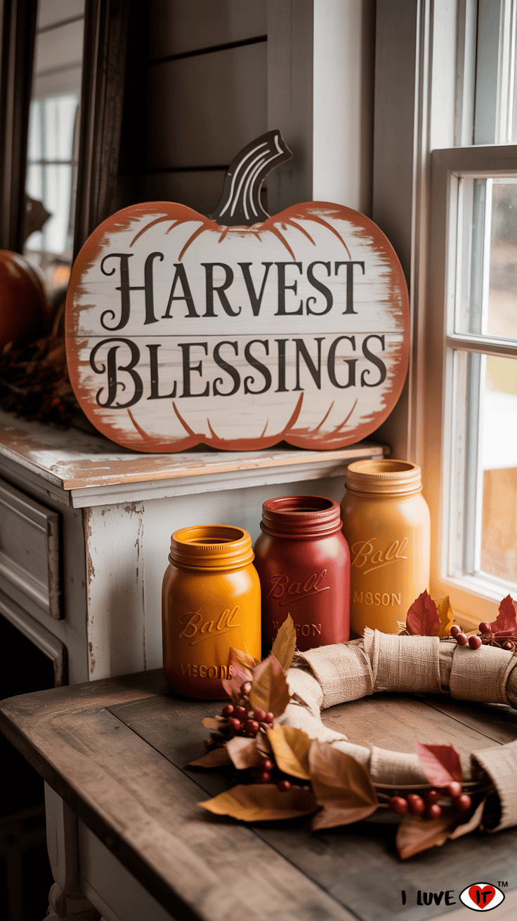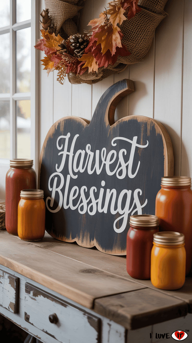 Frame your fireplace with a garland of fall foliage or eucalyptus leaves. Layer rustic wooden frames, vintage mirrors, and distressed lanterns. Finish the mantel with a statement sign—like “Thankful” or “Gather”—and scatter a few white or velvet pumpkins for texture.