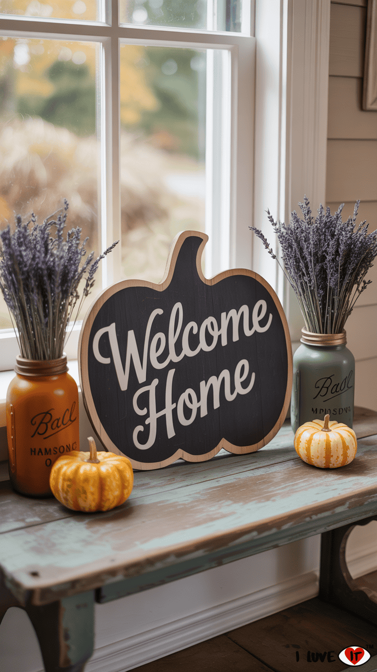 Nothing says welcome like a front porch filled with fall farmhouse charm. Use hay bales, a vintage ladder, lanterns, and a mix of real and faux pumpkins in varying sizes. Add a cozy plaid blanket to a rocking chair and a handmade wooden “Welcome Fall” sign for the perfect greeting.