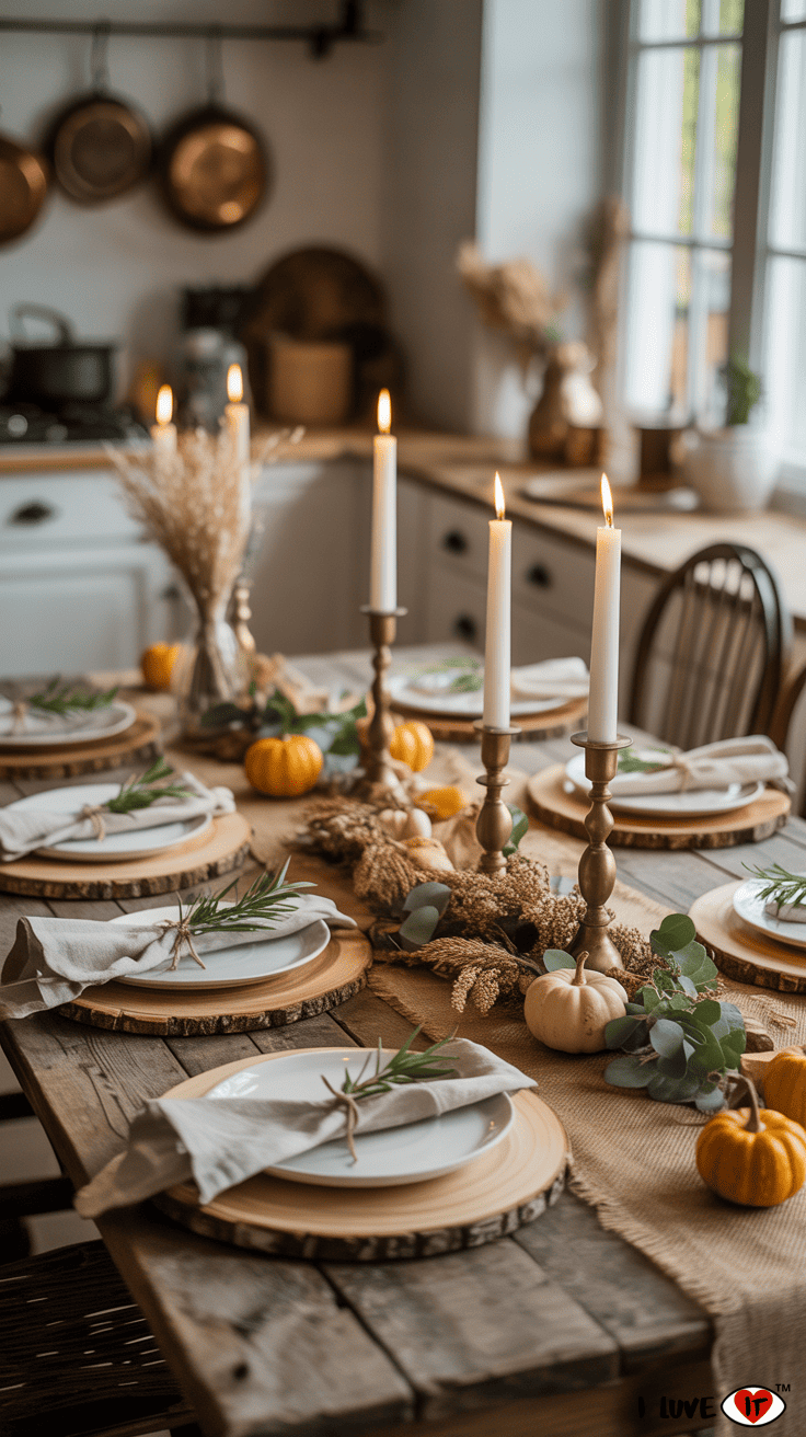 Set a rustic fall table using burlap runners, wooden chargers, and white ceramic plates. Incorporate vintage candlesticks, dried florals, and mini gourds for a simple yet elegant centerpiece. For a casual farmhouse twist, tie napkins with twine and tuck in a sprig of rosemary.