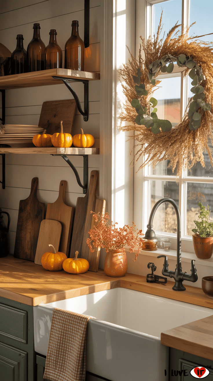 Decorate your farmhouse kitchen with amber glass bottles, wooden cutting boards, and mini pumpkins tucked into open shelving. Add a wreath made of wheat or eucalyptus for a natural feel, and place a few seasonal towels in gingham or buffalo check to bring in fall patterns.