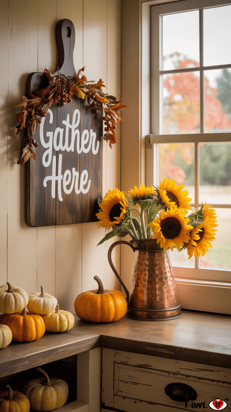 Bring rustic charm into the heart of the home by incorporating wood, metal, and natural elements. Use wooden cutting boards as wall decor, hang a harvest-themed sign, and display copper pots or vintage pitchers filled with fall florals. Tuck mini pumpkins into open shelves or windowsills, and consider a fall-scented candle to keep your kitchen smelling as warm as it looks.