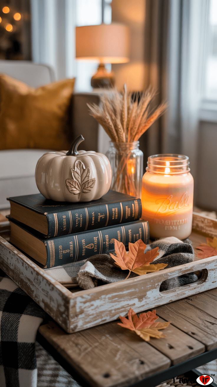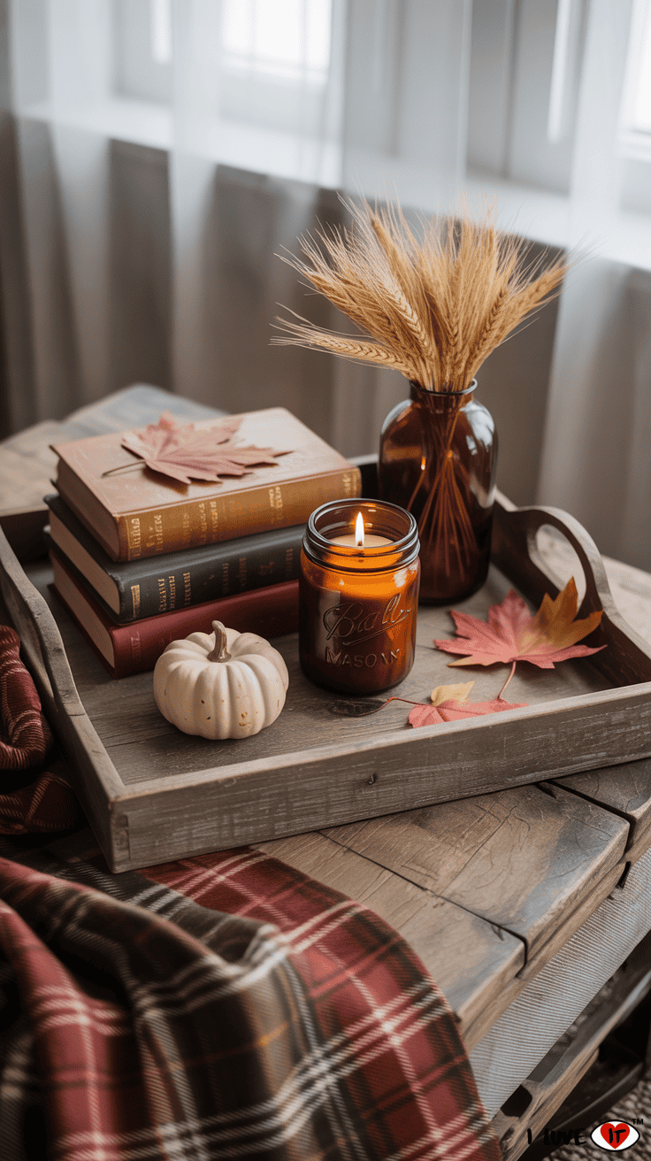 Dress up your coffee table with a mix of textures and autumn-inspired decor. A wooden tray can hold a stack of vintage books, a mason jar candle, and a ceramic pumpkin. Add a touch of nature with faux leaves, a bundle of wheat, or a small plaid throw draped underneath it all for that cozy, layered look.