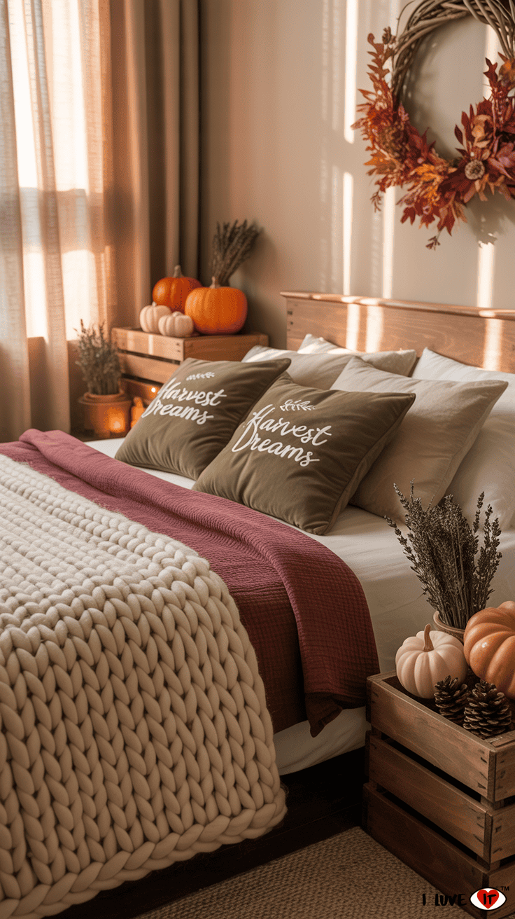 Create a rustic fall sanctuary in the bedroom by layering textures like chunky knit throws, flannel sheets, and burlap accents. Add touches of burnt orange, deep burgundy, and olive green through pillows or a seasonal wreath above your headboard. Wooden crates or baskets filled with faux pumpkins and pinecones add an extra fall feel without cluttering the space.